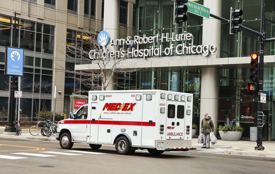 An ambulance is seen outside Ann &Robert H. Lurie Children’s Hospital of Chicago in Chicago, the United States, on Dec. 12, 2022. (Photo/Xinhua)