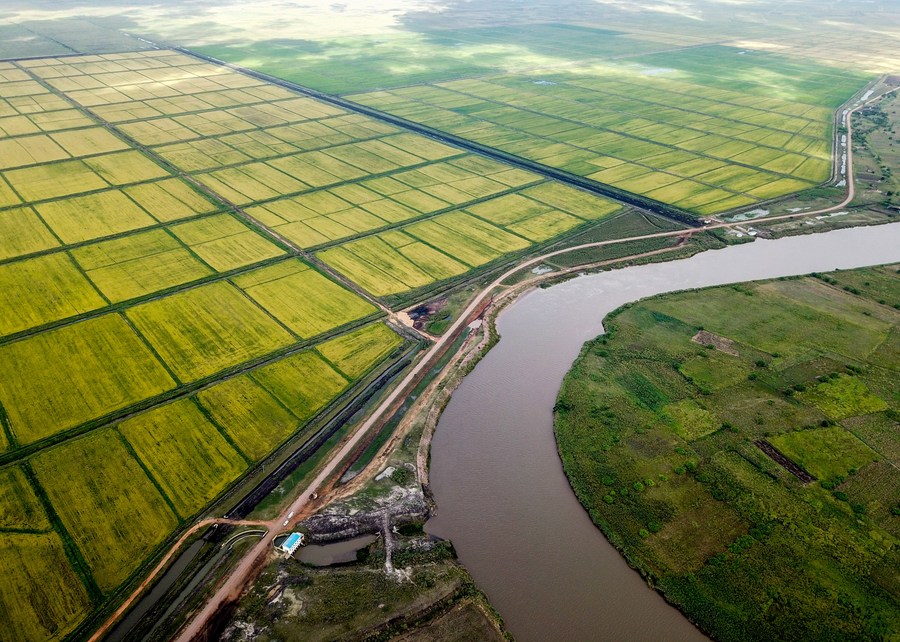 Aerial photo taken on Apr. 7, 2019 shows the Wanbao Mozambique rice farm in the Xai-Xai district of the southern Mozambican province of Gaza. The rice farm, invested by the China-Africa Development Fund, is China’s largest project of its kind in Africa. (Photo/Xinhua)