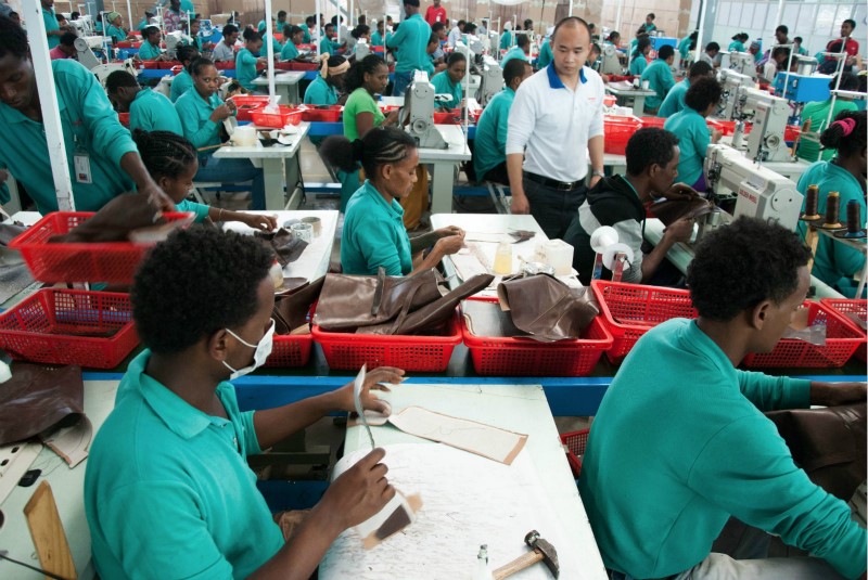 Δ?Ethiopian workers and Chinese management in the Huajian shoe factory in the Eastern Industry Zone near Addis Ababa, a Special Economic Zone modelled after China’s southern city of Shenzhen. (Photo / Michiel Hulshof & Daan Roggeveen)