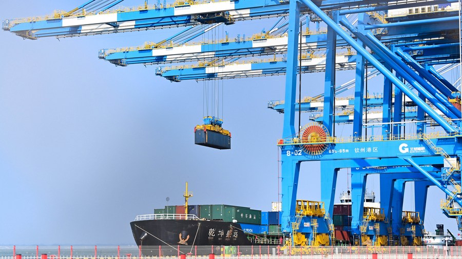 This photo taken on Feb. 25, 2023 shows an automatic container terminal at Qinzhou Port in south China’s Guangxi Zhuang Autonomous Region. (Photo/Xinhua)