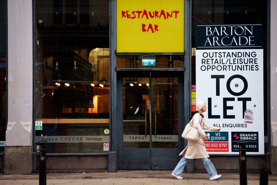 A woman passes a closed restaurant in Manchester, Britain, Nov. 22, 2023. (Photo/Xinhua)