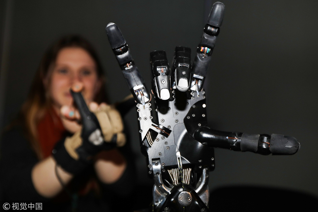 An attendee demonstrates a robotic hand at the AI Congress in London, U.K., on Jan. 30, 2018. (Photo/VCG)