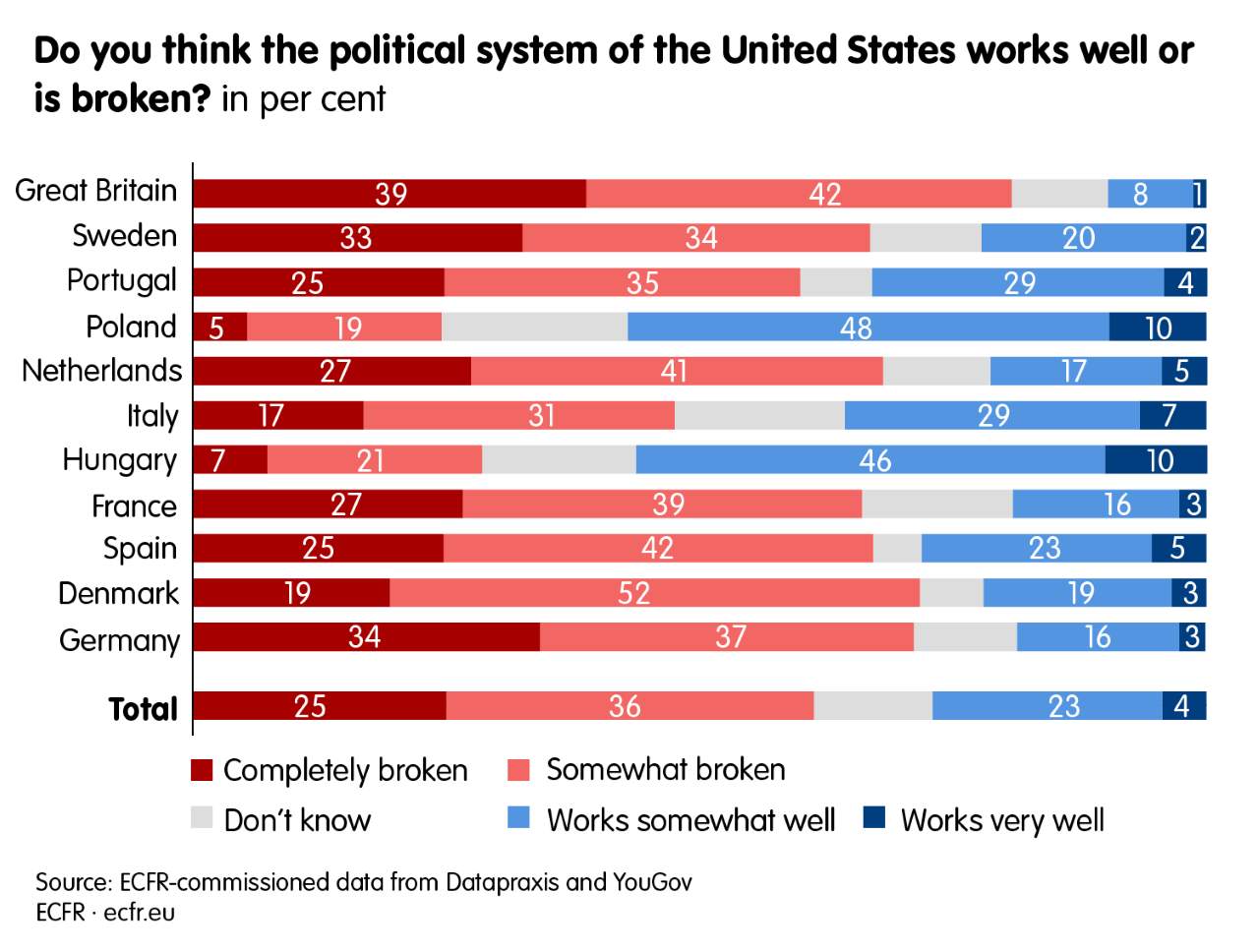 Asked whether the political system of the US “works well or is broken”, more than three in five respondents (61 percent) found the system completely or somewhat broken. A mere 10 percent viewed the US as a “reliable” security partner that would always protect Europe”. At least 60 percent in every one of the 11 countries surveyed said they doubted their country could depend on US support in the event of a crisis.