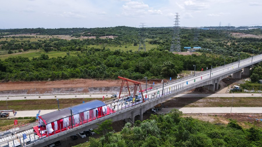 This aerial photo taken on Feb. 15, 2023 shows the construction site of the last ballastless track slab of Jakarta-Bandung High-Speed Railway in Karawang, West Java, Indonesia. (Photo/Xinhua)