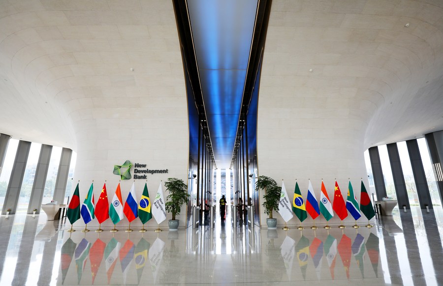 Photo taken on Sept. 28, 2021 shows the interior view of the headquarters building of the New Development Bank (NDB) in Shanghai, east China. (Photo/Xinhua)