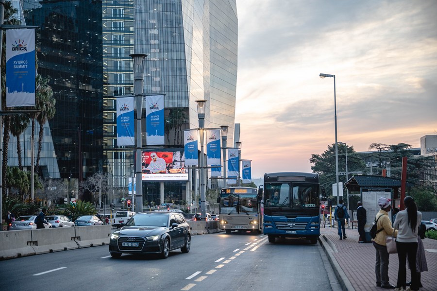 Signboards of the 15th BRICS summit are seen on a street of Johannesburg, South Africa, Aug. 17, 2023. (Photo/Xinhua)