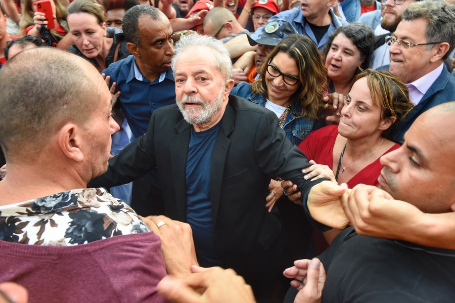 Brazil’s former President Luiz Inacio Lula da Silva (C) is received by a crowd of supporters and fellow politicians from the Workers’ Party (PT) as he leaves the Federal Police building in Curitiba, southern Brazil, on Nov. 8, 2019. (Photo/Agencia Estado via Xinhua)