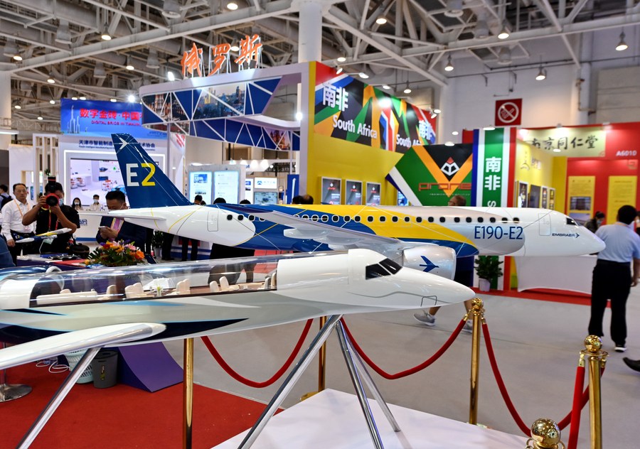 Photo taken on Sept. 8, 2021 shows models of jets during an exhibition on BRICS New Industrial Revolution held in Xiamen, southeast China’s Fujian Province. (Photo/Xinhua)