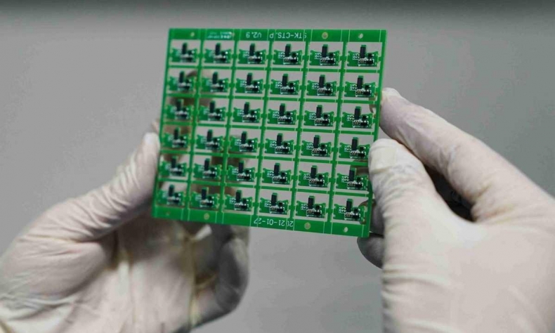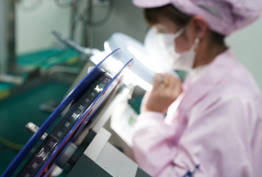 A staff member checks chip products at Nanjing V-Test Semiconductor Technology Co., Ltd. in Pukou Economic Development Zone of Nanjing, east China’s Jiangsu Province, Mar. 9, 2023. (Photo/Xinhua)