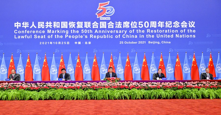 Chinese President Xi Jinping delivers an important speech at a commemorative meeting marking the 50th anniversary of the restoration of the People’s Republic of China’s lawful seat in the United Nations (UN), in Beijing, capital of China, Oct. 25, 2021. (Photo/Xinhua)