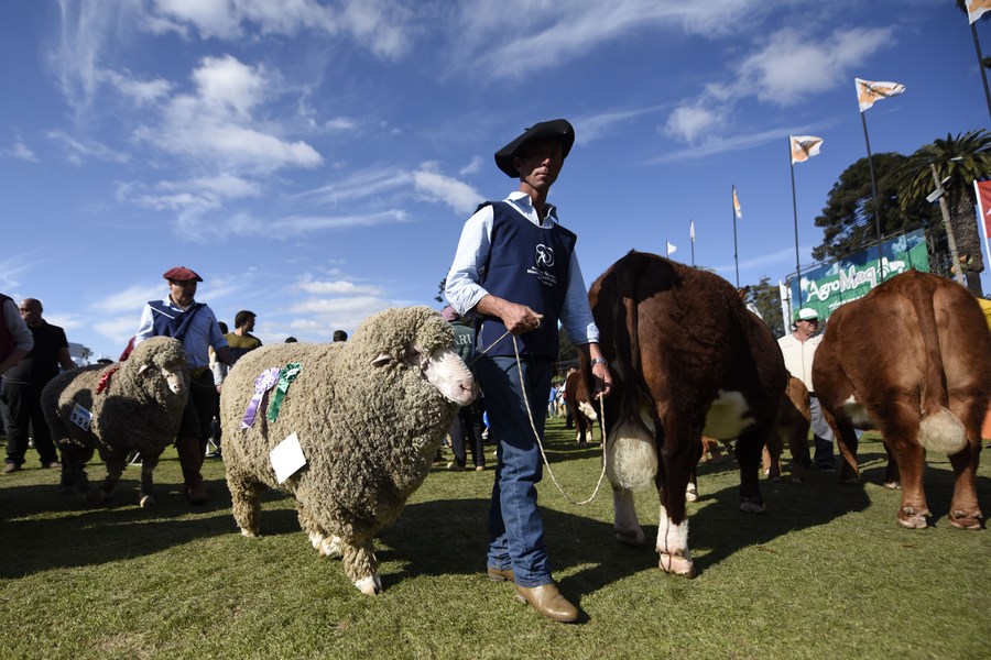 A keeper moves a sheep during the 113th Expo Prado 2018 held at the Rural del Prado in Montevideo, capital of Uruguay, on Sept. 11, 2018. (Photo/Xinhua)