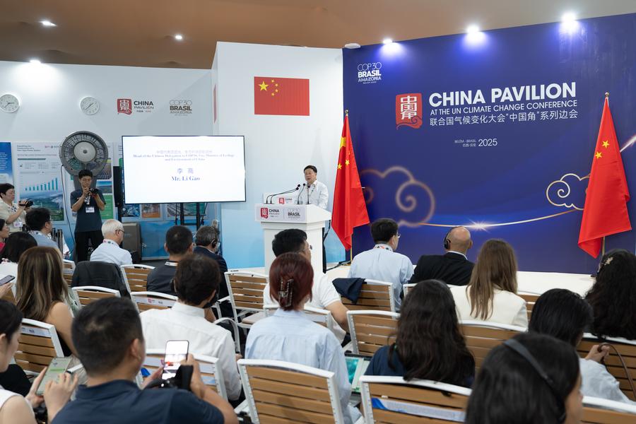 Li Gao, head of the Chinese delegation and vice minister of ecology and environment, speaks at a high-level side event during the COP30 in Belem, Brazil, Nov. 12, 2025. (Photo/Xinhua)