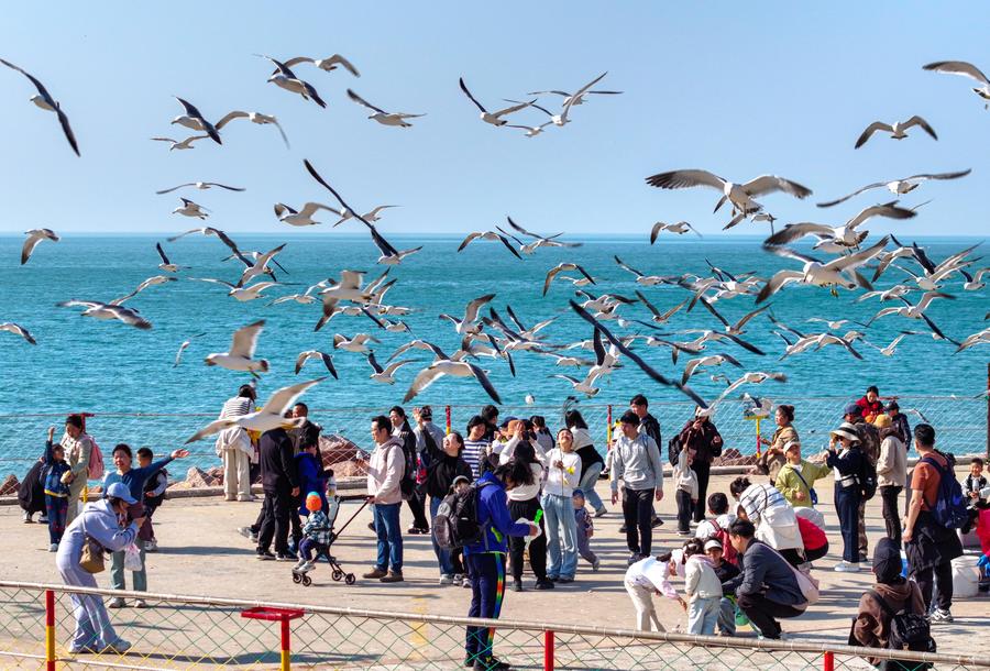 A drone photo taken on Apr. 6, 2025 shows tourists interacting with black-tailed gulls on the coastal of a wildlife park near Xixiakou Village, Rongcheng City, east China’s Shandong Province. (Photo/Xinhua)
