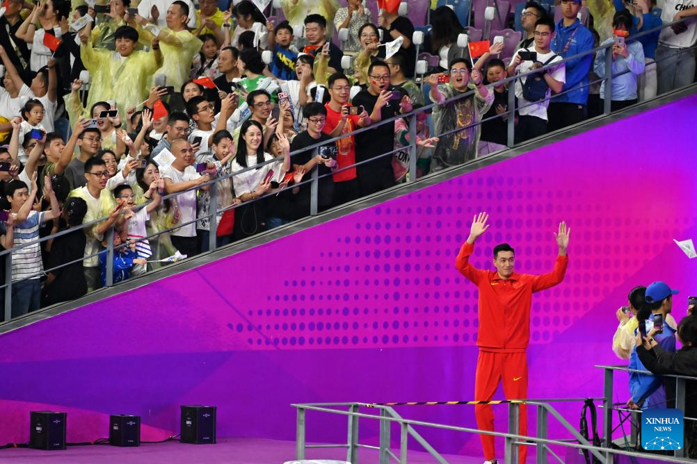 Zhu Yaming of China reacts before the Men’s Triple Jump Final of Athletics at the 19th Asian Games in Hangzhou, east China’s Zhejiang Province, Oct. 3, 2023. (Xinhua/Jiang Han)
