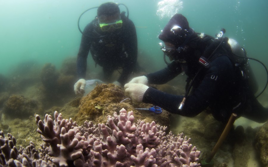 People transplants corals at a marine ranch in the sea area of Wuzhizhou Island in Sanya, south China’s Hainan Province, May 17, 2023. (Photo/Xinhua)