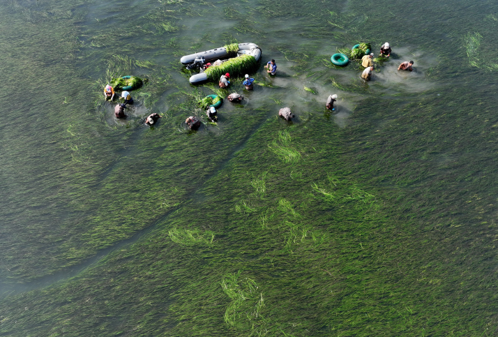 Workers collect eelgrass seedlings under a local marine ecological protection and restoration project in Caofeidian District, Tangshan City of Hebei Province, on Jun. 25, 2023. (Photo/Xinhua)