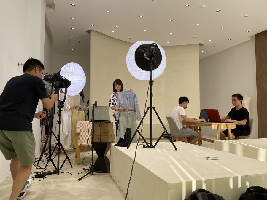 A livestreamer works at Changshu Garments Town in Changshu, east China’s Jiangsu Province, Aug. 17, 2020. (Photo/Xinhua)