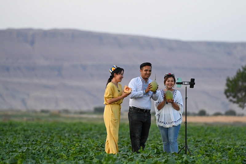 Farmers sell cantaloupes via live-streaming at a farm in Turpan, Xinjiang, on May 19, 2021. (Photo/Xinhua)
