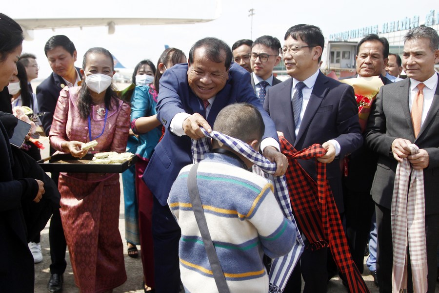 Cambodia’s Tourism Minister Thong Khon (C) presents a Chinese boy with a Cambodian traditional scarf at the Phnom Penh International Airport in Phnom Penh, Cambodia, Feb. 7, 2023. (Photo/Xinhua)