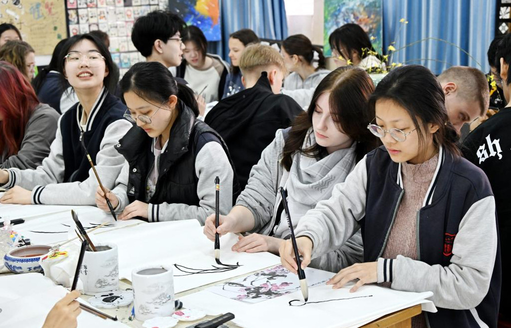 Chinese and German students experience Chinese painting in Qingdao No. 9 High School in Qingdao, east China’s Shandong Province, Mar. 21, 2024.