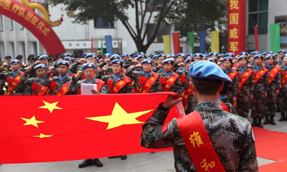 Please bear in mind: for the sake of world peace, there exists a group of Chinese soldiers fulfilling their mission of maintaining peace, bringing confidence to conflict areas of the world one-by-one, bringing hope to local people. We are watering the beautiful flowers of global peace with our blood, winning the respect of the world.