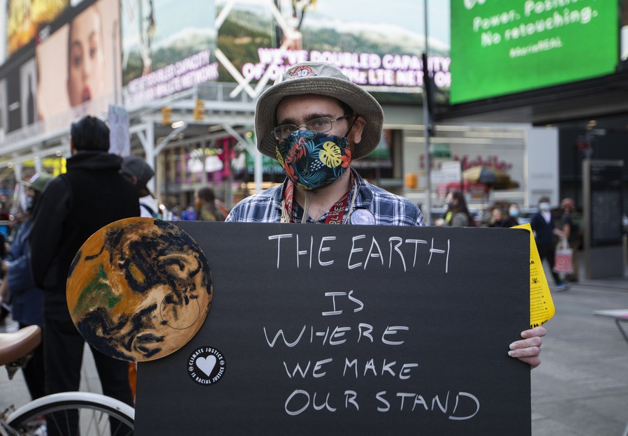 A man takes part in a climate change protest in Times Square in New York, the United States, on Sept. 20, 2020. (Photo/Xinhua)