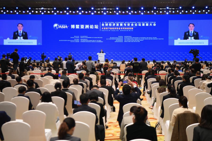 Photo taken on Oct. 19, 2021 shows the opening ceremony of the first Global Economic Development and Security Forum of the Boao Forum for Asia (BFA) in Changsha, central China’s Hunan Province. (Photo/Xinhua)