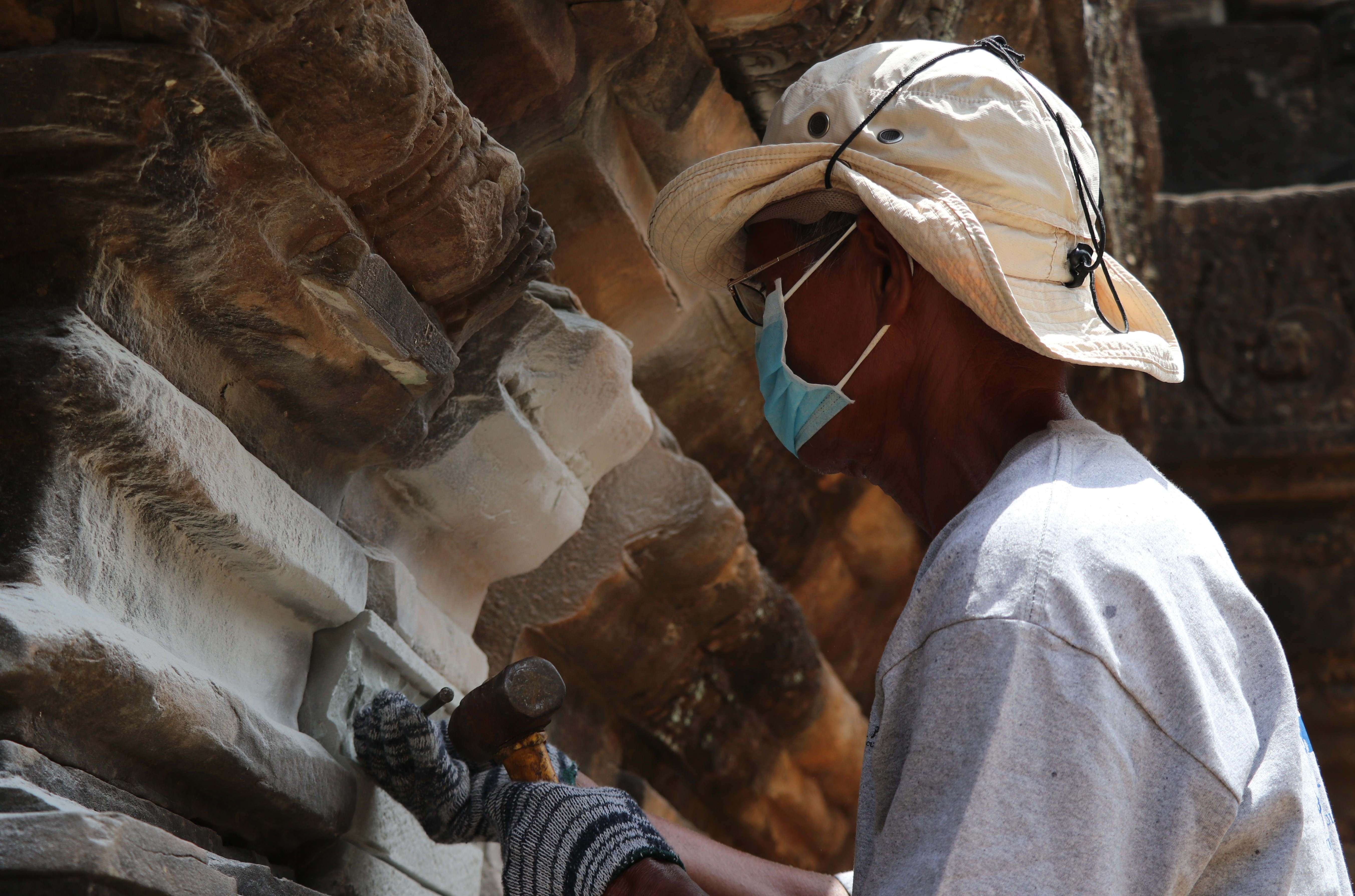 Of the more than 10,000 stone components in Ta Keo, some are buried deep underground while others are broken and worn. The largest component weighs four tons, while the smallest is only five centimeters long. The archaeologists had to find broken stone components and locate their position before filling in gaps with restored stone components.