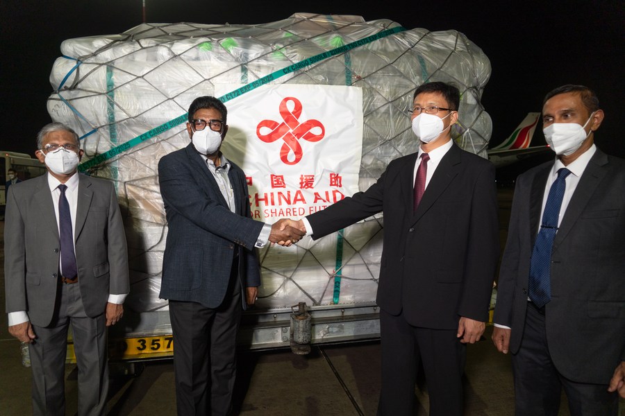 Chinese Ambassador to Sri Lanka Qi Zhenhong (2nd R) and Sri Lankan Minister of Health Keheliya Rambukwella (2nd L) attend the handover ceremony of Chinese emergency humanitarian medicine aid at Bandaranaike International Airport in Colombo, Sri Lanka, Jun. 3, 2022. (Photo/Xinhua)