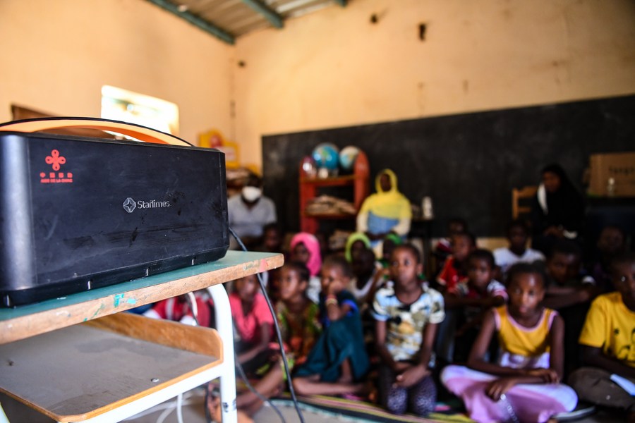 Students watch satellite television via projector provided by Chinese media company StarTimes under a China-funded project at a school on the outskirts of Dakar, Senegal, Nov. 22, 2021. (Photo/Xinhua)