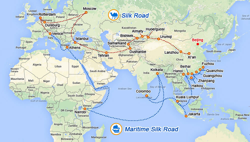 Δ Map of the New Silk Road Economic Belt and 21st Century Maritime Silk Road. (Photo/Xinhua)