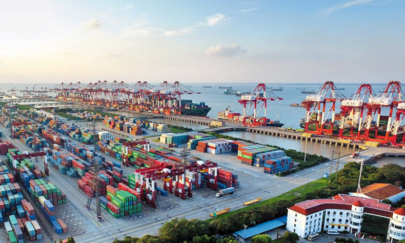 An aerial photo of a container dock of Yangshan Port, Shanghai, on April 23, 2017. [Photo/Xinhua]