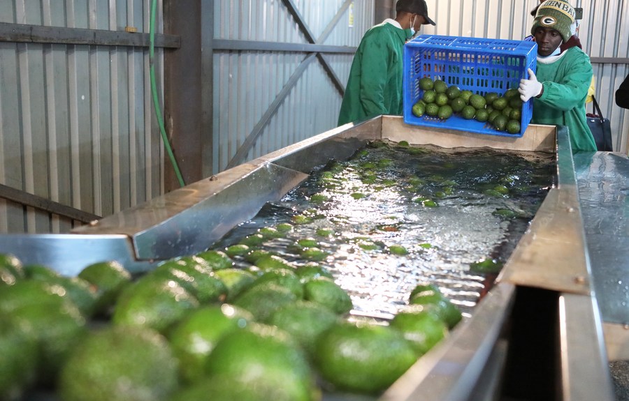 A staff member pours fresh avocados into water to wash them at Sunripe factory in Limuru Town, Kiambu County, Kenya, on Aug. 2, 2022. Kenya became the first African country to export fresh avocados to China in a move set to further boost the economic ties between the two countries. (Photo/Xinhua)
