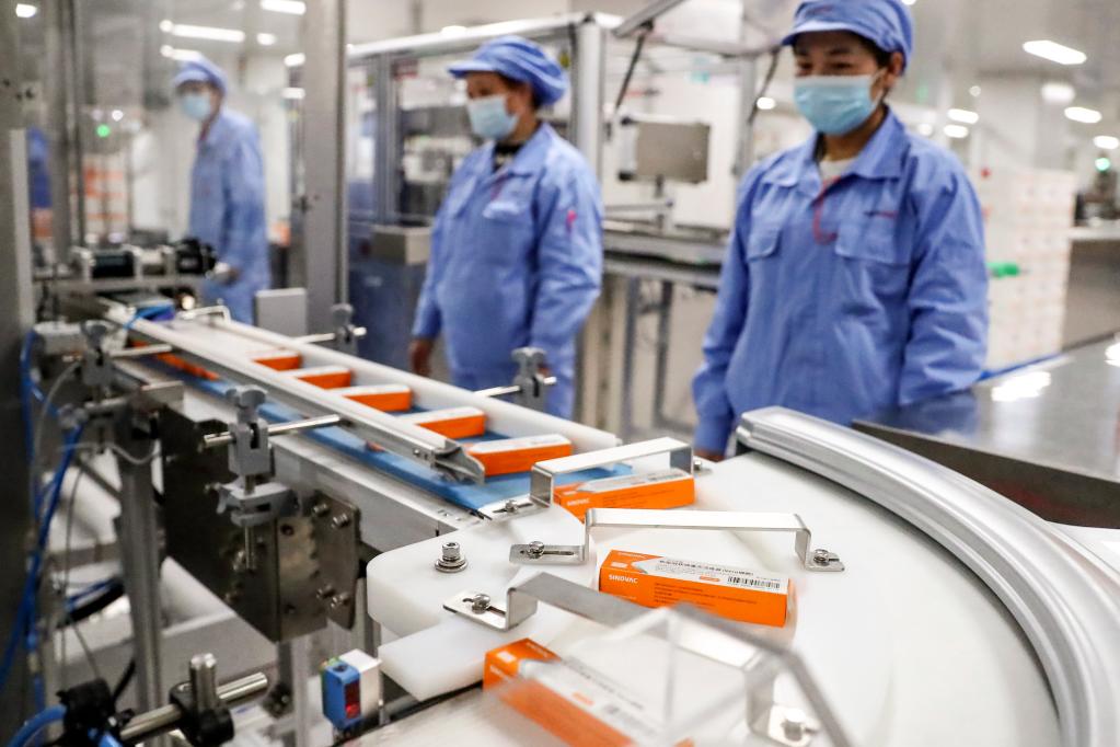 Staff members supervise the operation of an automated packing line for inactivated COVID-19 vaccine at Sinovac Life Sciences Co., Ltd. in Beijing, capital of China, on Jan. 6, 2021. (Photo/Xinhua)