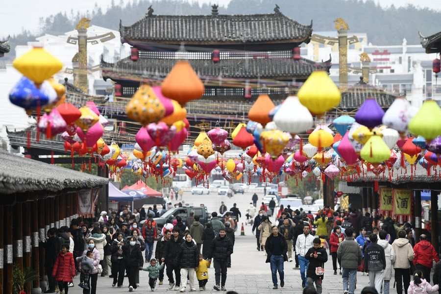 People tour Jiuzhou ancient town in Huangping County, southwest China’s Guizhou Province, Jan. 26, 2023. (Photo/Xinhua)
