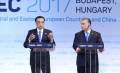 ▲?Premier Li Keqiang and leaders from Central and Eastern European countries view a model of a Chinese high-speed train at an exhibition of Chinese equipment in Bucharest, the Romanian capital, on? Nov. 26, 2013. [Xinhua]