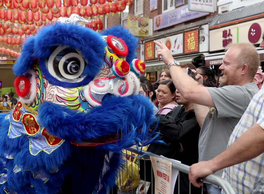 Locals watch a lion dance performance at a show for the celebration of the Chinese Mid-Autumn Festival in London, Britain, Sept. 24, 2023. (Photo/Xinhua)