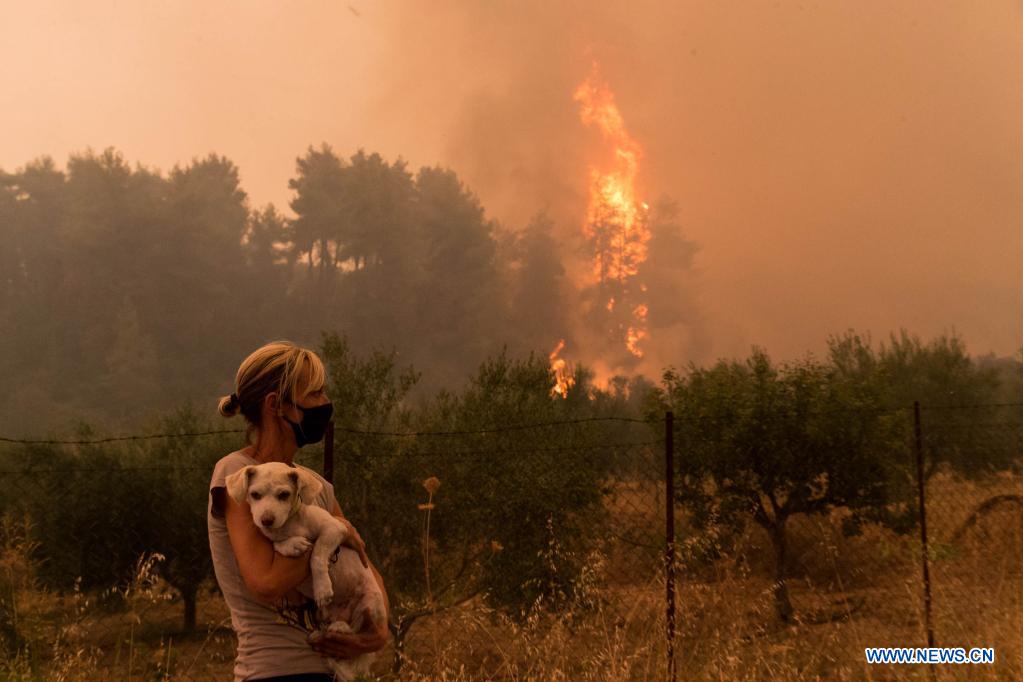 A woman stands holding her dog while a blaze is seen burning a forest in northern Evia island, Greece, Aug. 8, 2021. (Photo/Xinhua)