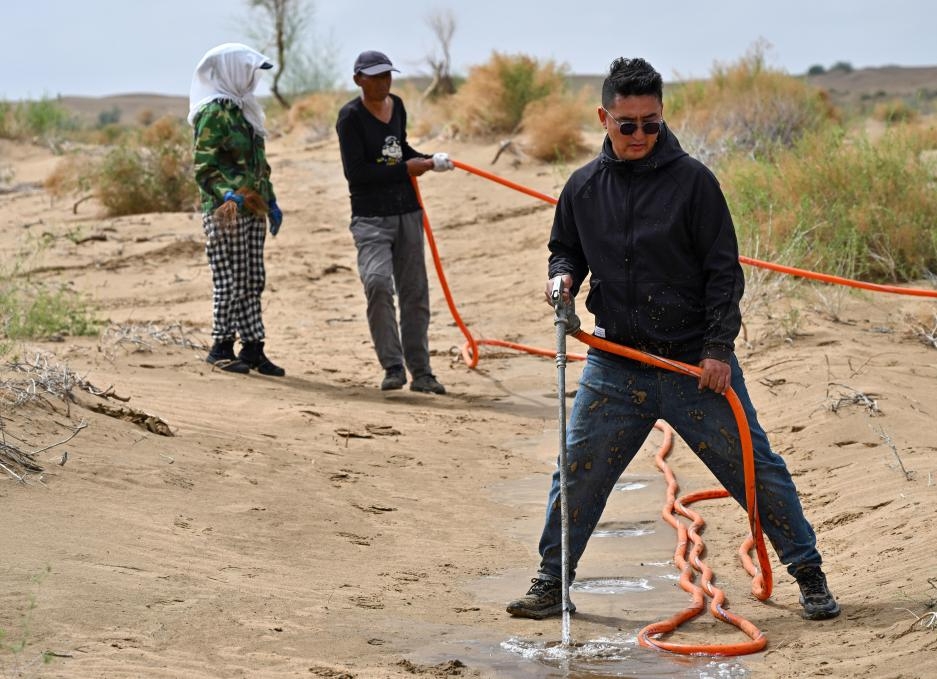 Workers plant trees with a minimally invasive method in the Kubuqi Desert in Hanggin Banner, Inner Mongolia Autonomous Region, on Jun. 5, 2024. (Photo/Xinhua)
