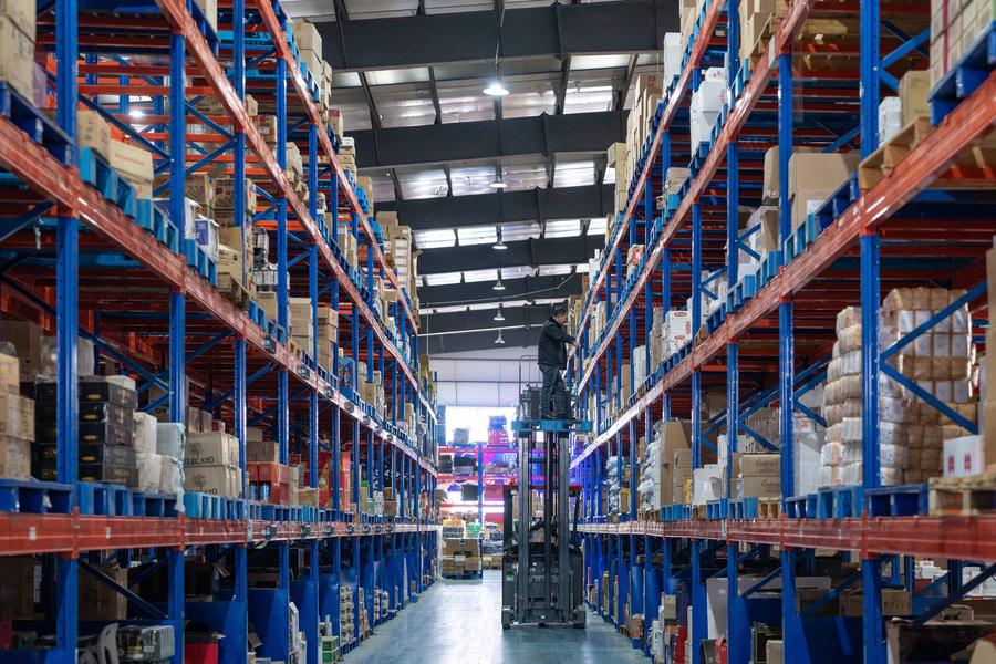 A staff member looks for goods at a logistics center in the Heihe Area of China (Heilongjiang) Pilot Free Trade Zone in Heihe, northeast China’s Heilongjiang Province, Jan. 31, 2024. (Photo/Xinhua)