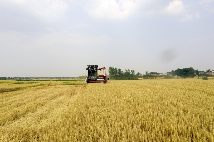 Aerial photo shows farmers harvesting wheat in the fields in Huozhuang Village of Wuhe County, east China’s Anhui Province, May 23, 2022. (Photo/Xinhua)