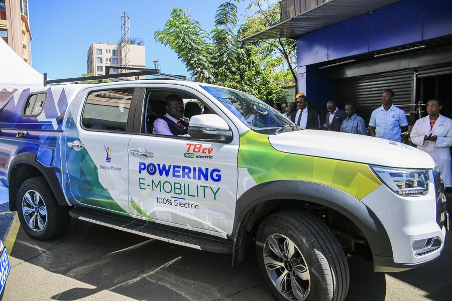 Kenya Power Managing Director Joseph Siror (Front) drives a JAC electric vehicle from China in Nairobi, Kenya, on Apr. 22, 2024. (Photo/Xinhua)