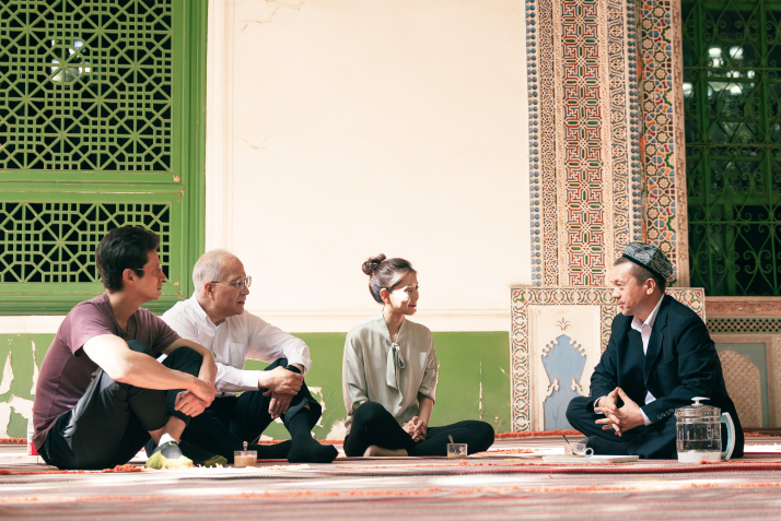 Einar Tangen (second left) interviews an imam at the Id Kah Mosque for a documentary titled Inside China produced by Miao Xiaojuan Studio, Xinhua News Agency, in Kashi (Kashgar) Prefecture on Sept. 17, 2021. (Photo/Xinhua)
