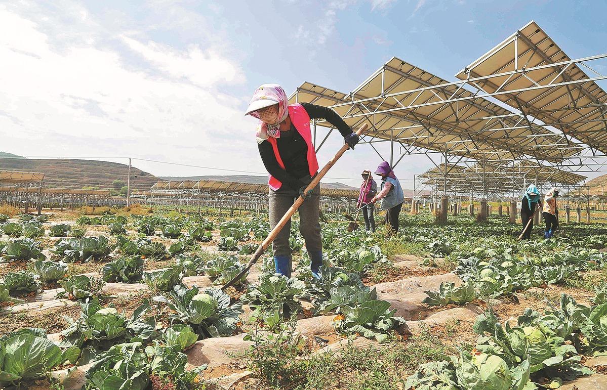 Farmers plant cabbages near PV panels in Tongwei, Gansu province, on Sept. 9, 2023. (Photo/Xinhua)