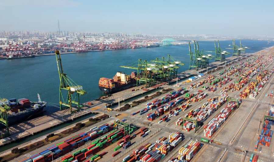 Aerial photo taken on Jan. 11, 2021 shows a view of the Pacific international container terminal at the Tianjin Port of north China’s Tianjin Municipality. (Photo/Xinhua)