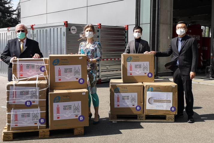 Thomas Rabe (left), a doctor of the Heidelberg University School of Medicine, and a representative of Heidelberg (second left) receive coronavirus medical supplies from staff members of the Chinese Embassy in Germany, in Heidelberg, Germany, on April 21 (Photo: Xinhua)