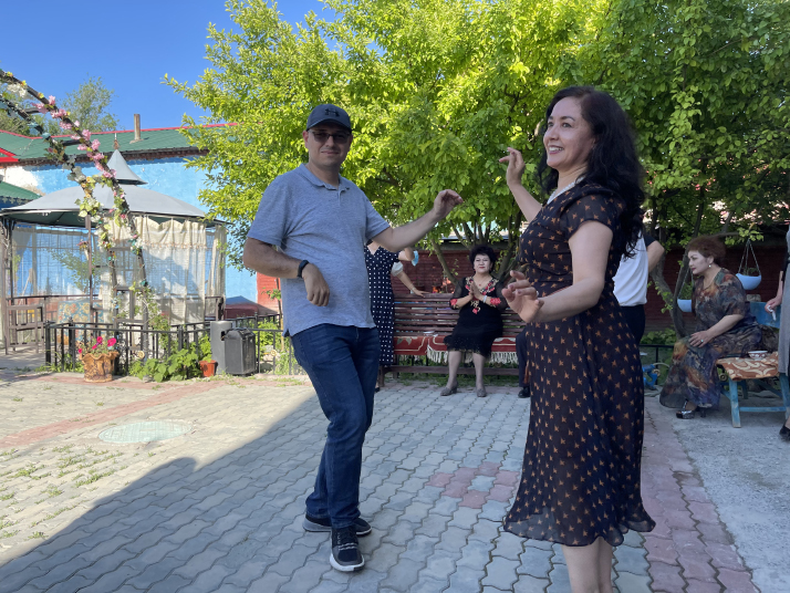 Rafael Henrique Zerbetto dances with a local resident in Tacheng. (Photo/Beijing Review)