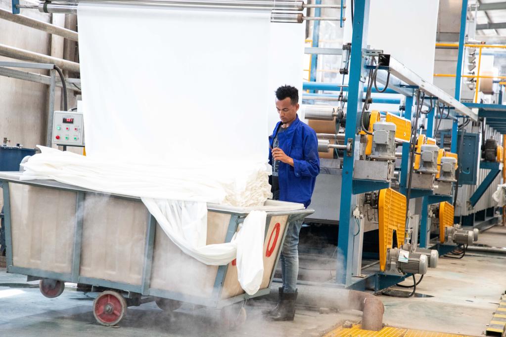 A local employee works in a printing and dyeing factory of Zhejiang Mina Textile Co., Ltd. in Sebeta, Ethiopia, on Nov. 16, 2022. (Photo/Xinhua)