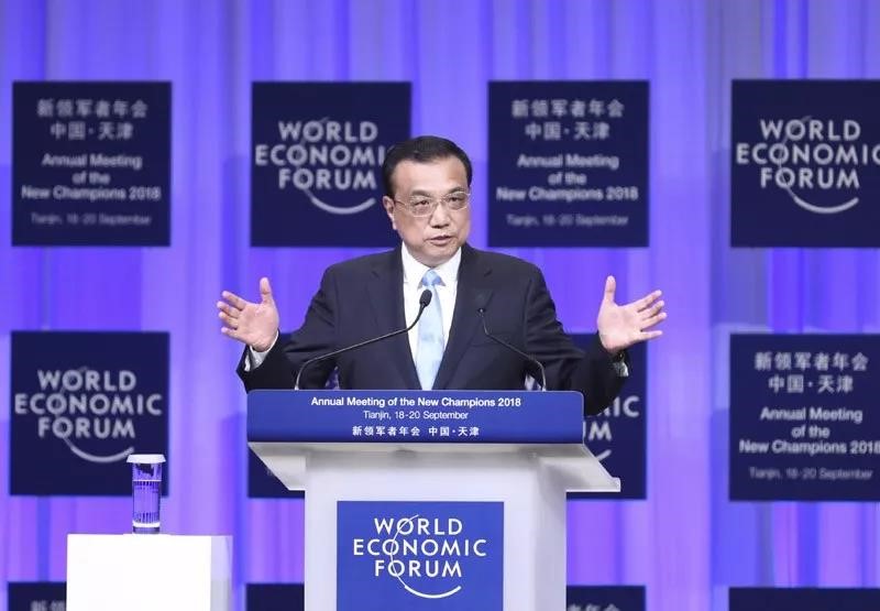 Δ?Chinese Premier Li Keqiang addresses the opening plenary of the Annual Meeting of the New Champions 2018, also known as Summer Davos, in Tianjin, north China, Sept. 19, 2018. (Photo/Xinhua)