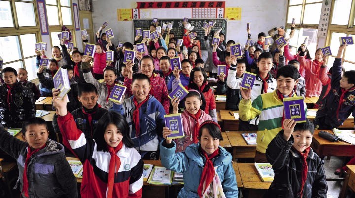 Pupils in Xuan’en County, Hubei Province, receive dictionaries for free on March 14, 2013.